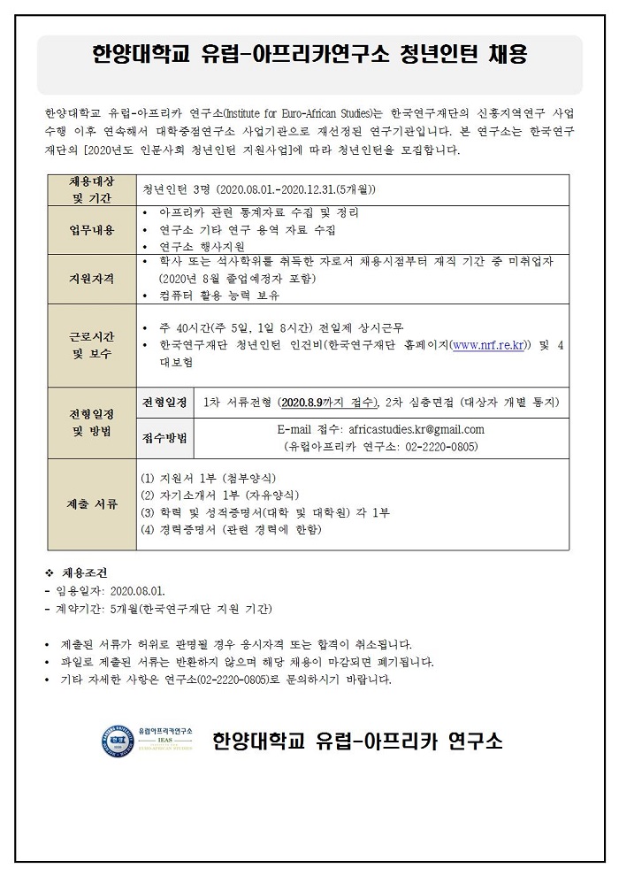 한양대학교 유럽-아프리카연구소 청년인턴 채용 건