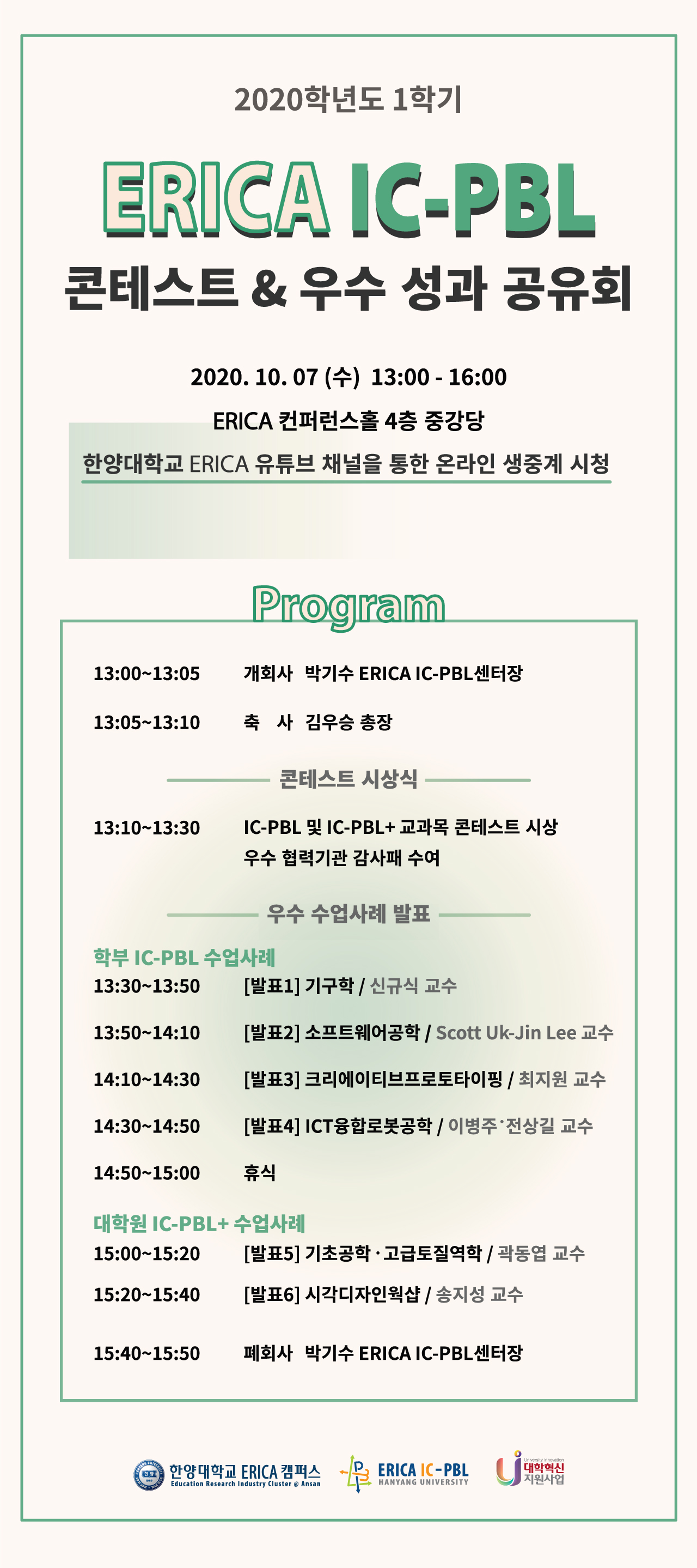 붙임 2020학년도 1학기 ERICA IC-PBL 콘테스트 & 우수 성과 공유회 안내. 끝.