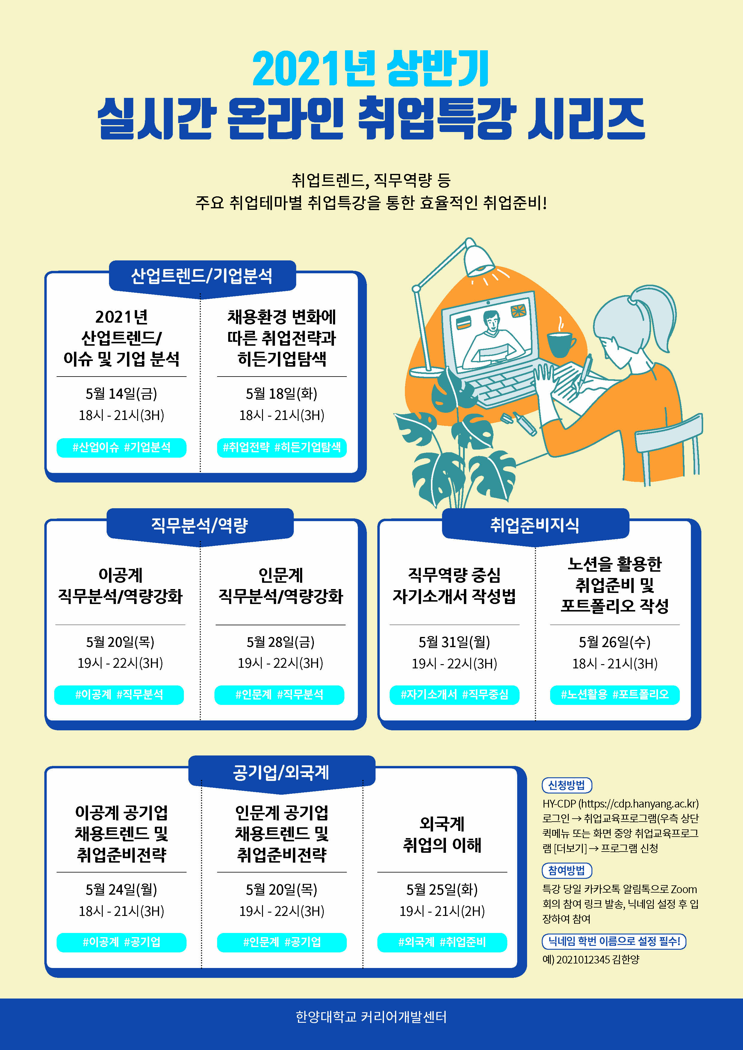 한양인재개발원 커리어개발센터에서는 취업지원을 위해 「2021학년도 상반기 온라인 취업특강 시리즈」를 진행합니다.