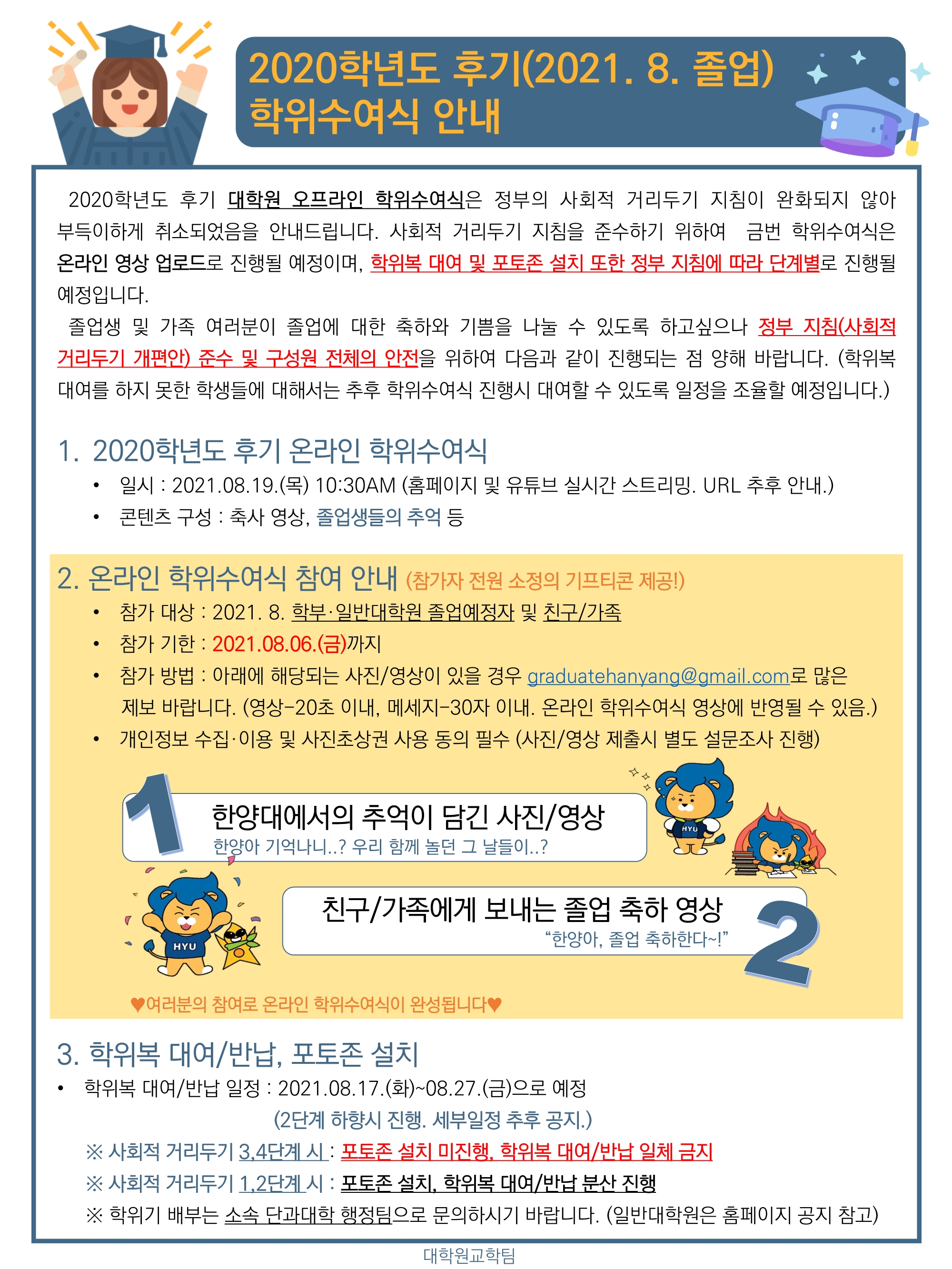 2020학년도 후기 학부, 대학원 학위수여식 취소 안내(2021년 8월 졸업)