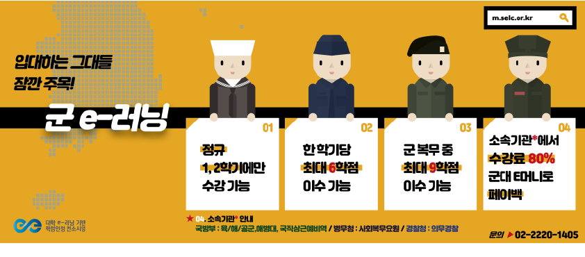 ● 소속기관(국방부, 병무청, 경찰청)에서 수강료 80% + 수수료 11,000원 지원(문의 : 군인공제회 02) 2139-0672) |