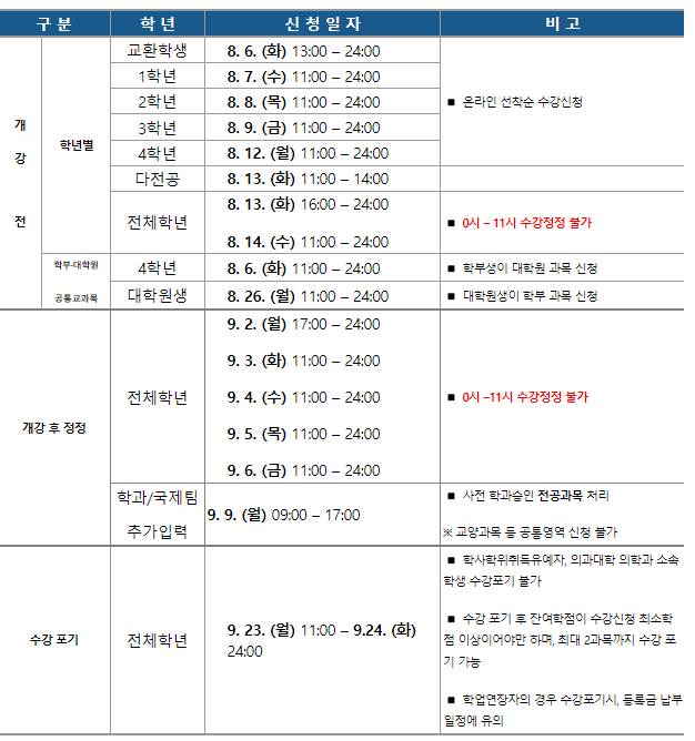 * 「다전공 수강신청기간」이 추가됨에 따라, 「전학년 수강정정」 시작시간이 오후로 조정되었습니다.