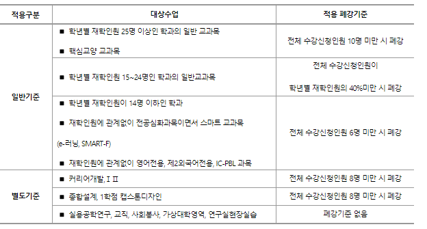 폐강처리 이후 진행 폐강대상강좌 수강신청자 중 폐강처리 시점까지 수강정정하지 않은 학생은 추후 소속학과에서 수강정정이 이루어지며, 그 대상은 여석이 남아있는 교과목으로 제한됩니다.