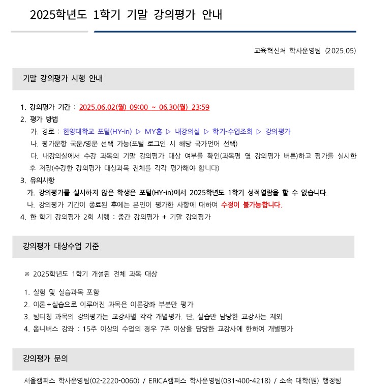 ★★★[학부] 2025학년도 1학기 기말 강의평가 실시 안내