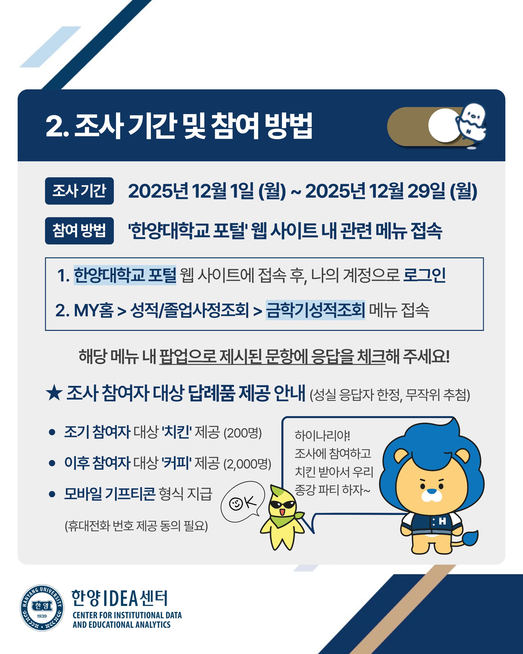 1. 기획처 한양IDEA센터에서는 2025년 12월 중 우리 대학 서울·ERICA 학부 재학생을 대상으로, 대학 생활 전반에서의 경험을 파악하고 이에 기반하여 학내 여러 유용한 정책과 프로그램을 개발 및 제공하고자 '한양인 성장경험 및 성취 학생 조사'(Hanyang IDEA Student Survey)를 시행하고 있습니다.