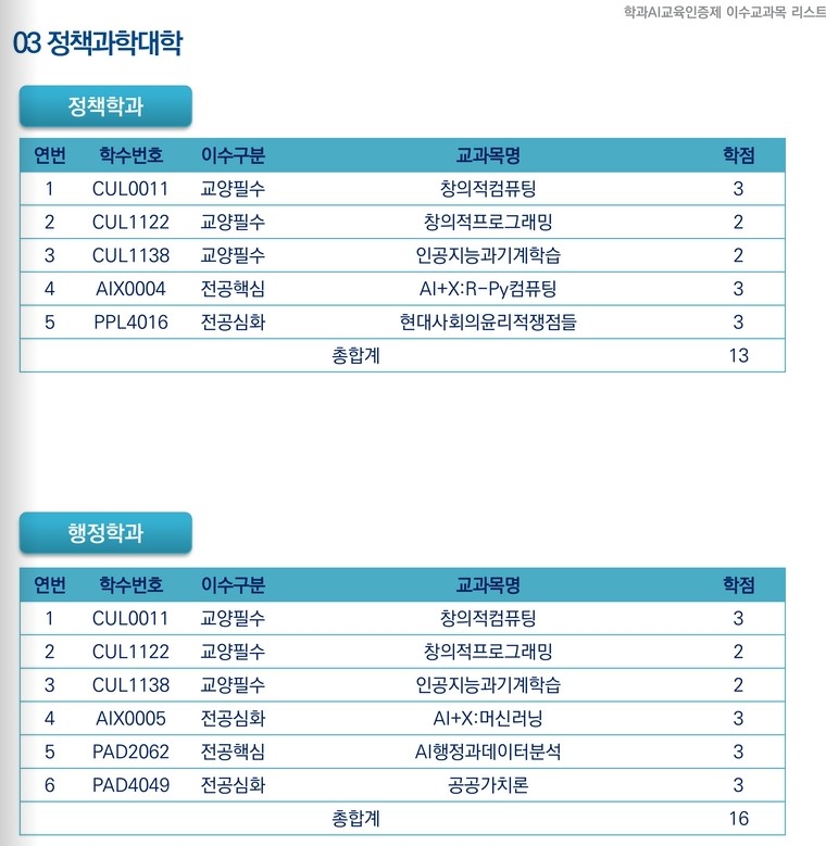 * 교육혁신처 교육전략기획팀에서는 학과, 대학단위의 인공지능 교육 강화를 위해 2025학년도 2학기부터 「학과AI교육인증제」를 운영할 예정입니다. 이에 정책학과와 행정학과의 학과AI교육인증제 과목 리스트를 공유드립니다. 자세한 내용은 PDF 참조 부탁드립니다.