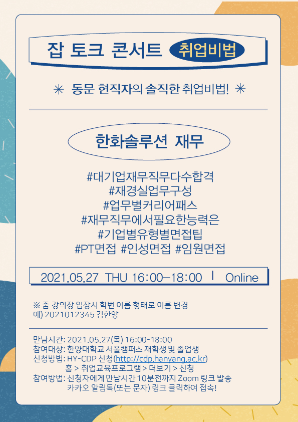 5. 참여방법: HY-CDP를 통해 신청하면(로그인>홈>취업교육프로그램) 시작 10분전까지 Zoom 링크발송