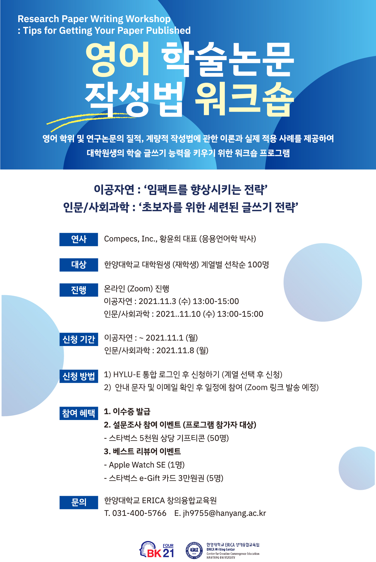창의융합교육팀에서는 대학원생의 학술 글쓰기 능력 향상을 위한 BK21사업 ‘영어 학술논문 작성법 워크숍’ 프로그램을 진행하고자 합니다.