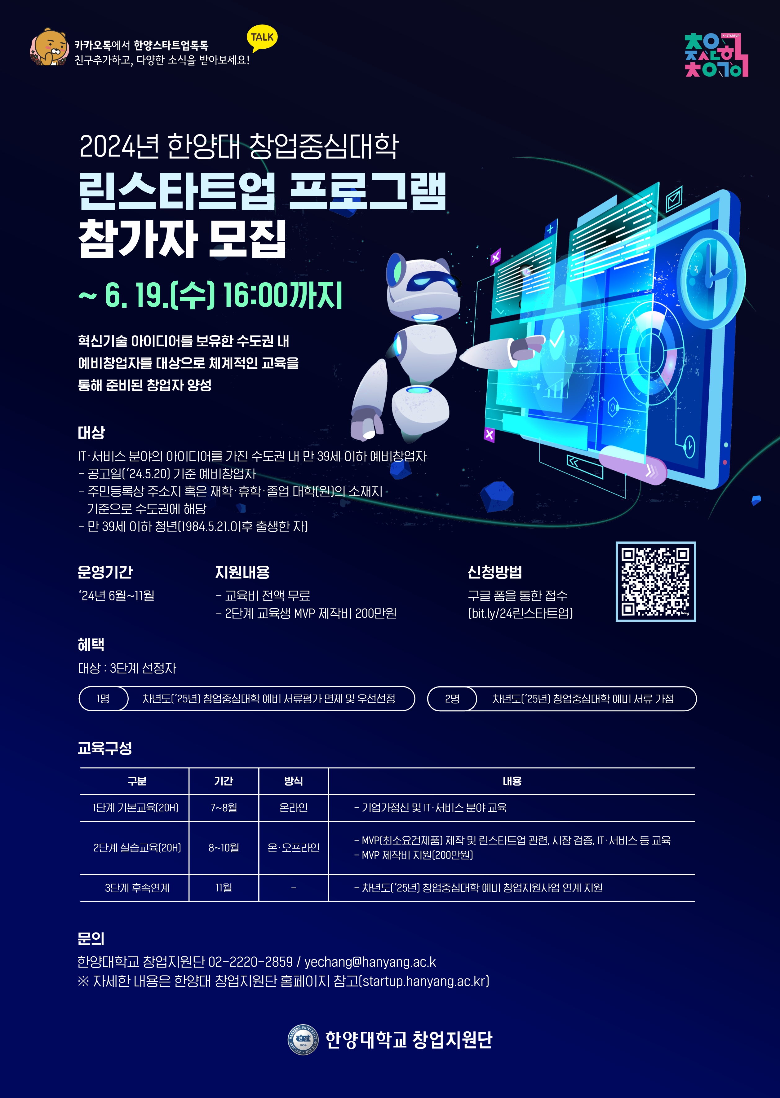 1. 2024년 한양대학교 창업중심대학 린스타트업 프로그램 모집 포스터 1부.