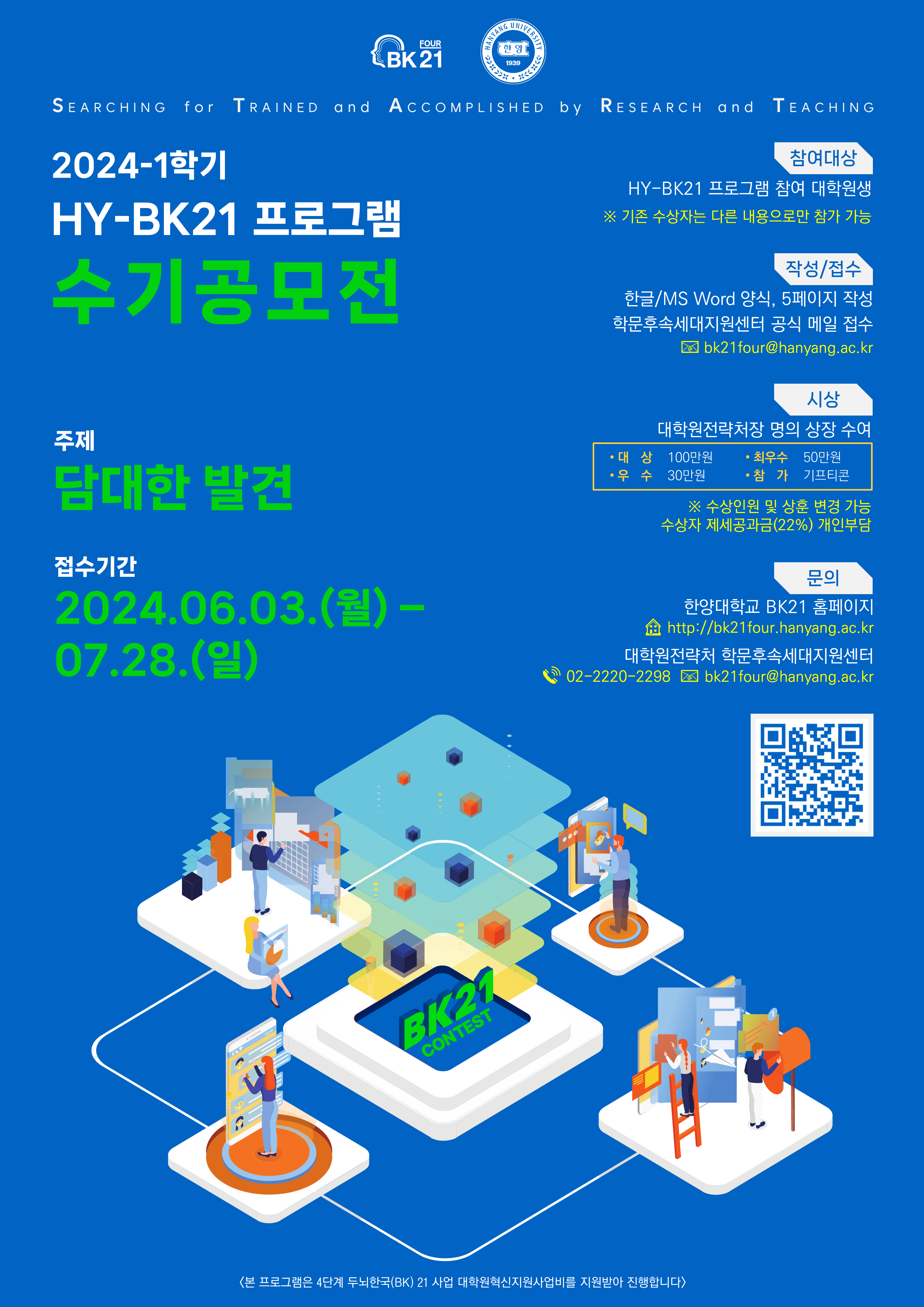 4단계 BK21 대학원 혁신지원사업의 일환으로 2024-1학기 HY-BK21 프로그램 수기 공모전(HY-START)을 안내하오니 관심있는 학생들의 많은 참여 바랍니다.
