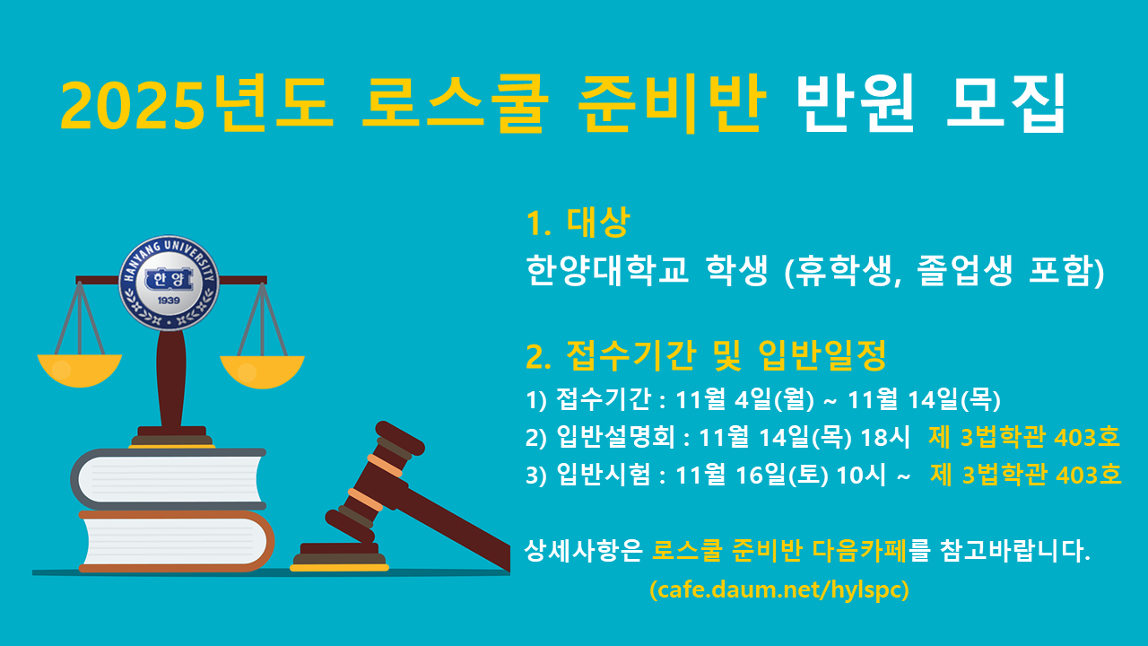한양대학교 로스쿨 준비반에서 아래와 같이 2026학년도 로스쿨 진학을 준비하는 신규 반원을 모집하오니, 많은 관심과 지원을 바랍니다.
