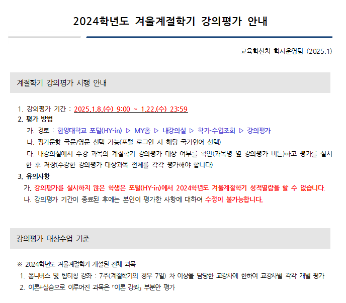 * 겨울계절학기 강의평가 안내