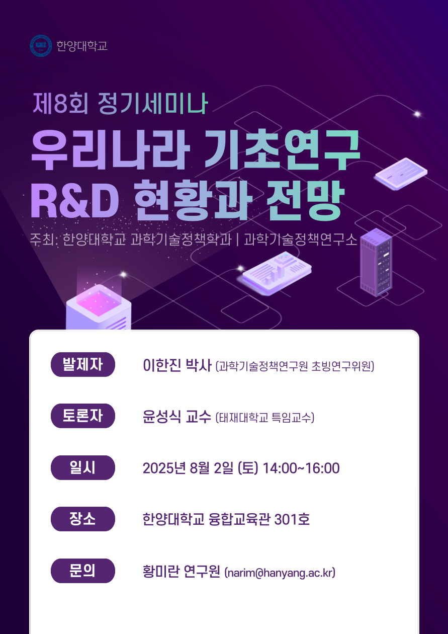 한양대학교 과학기술정책학과에서는 '과학기술전문인력 육성・지원' 사업의 일환으로 재학생 및 참여자 여러분의 지식과 역량을 더욱 높이기 위해 정기적으로 세미나를 개최하고 있습니다.