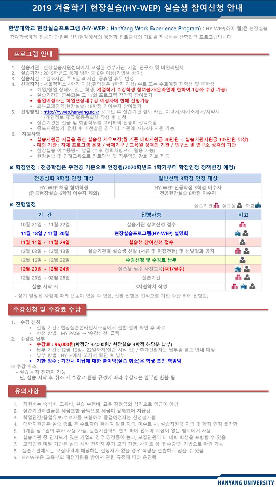 현장실습지원센터에서는 전공과 관련된 현장실습을 통한 진로탐색과 경력개발의 기회제공을 목적으로 HY-WEP(Hanyang Work Experience Program)을 운영하고 있습니다. 2019학년도 겨울학기 HY-WEP 운영을 다음과 같이 안내합니다.