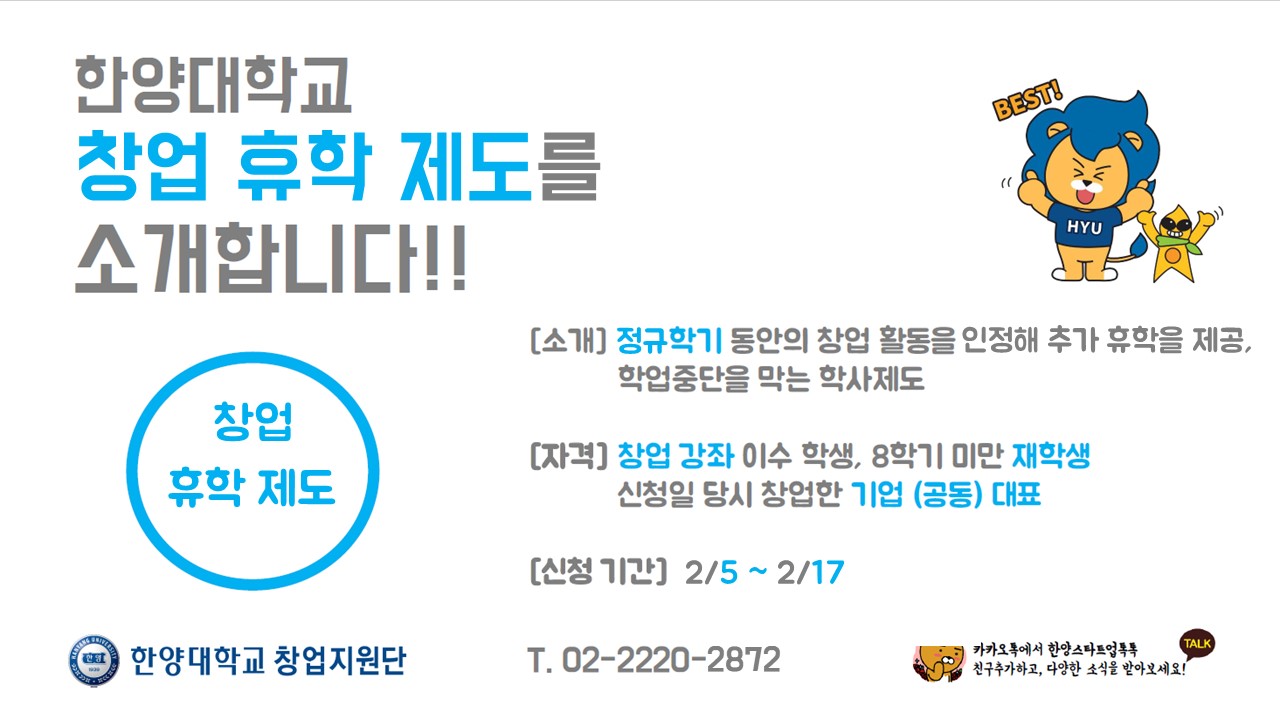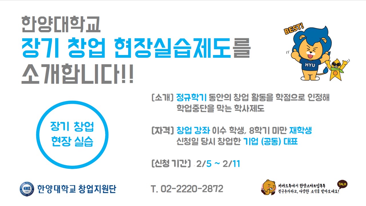 - 창업지원단 박재웅 (02-2220-2872, startup@hanyang.ac.kr)
