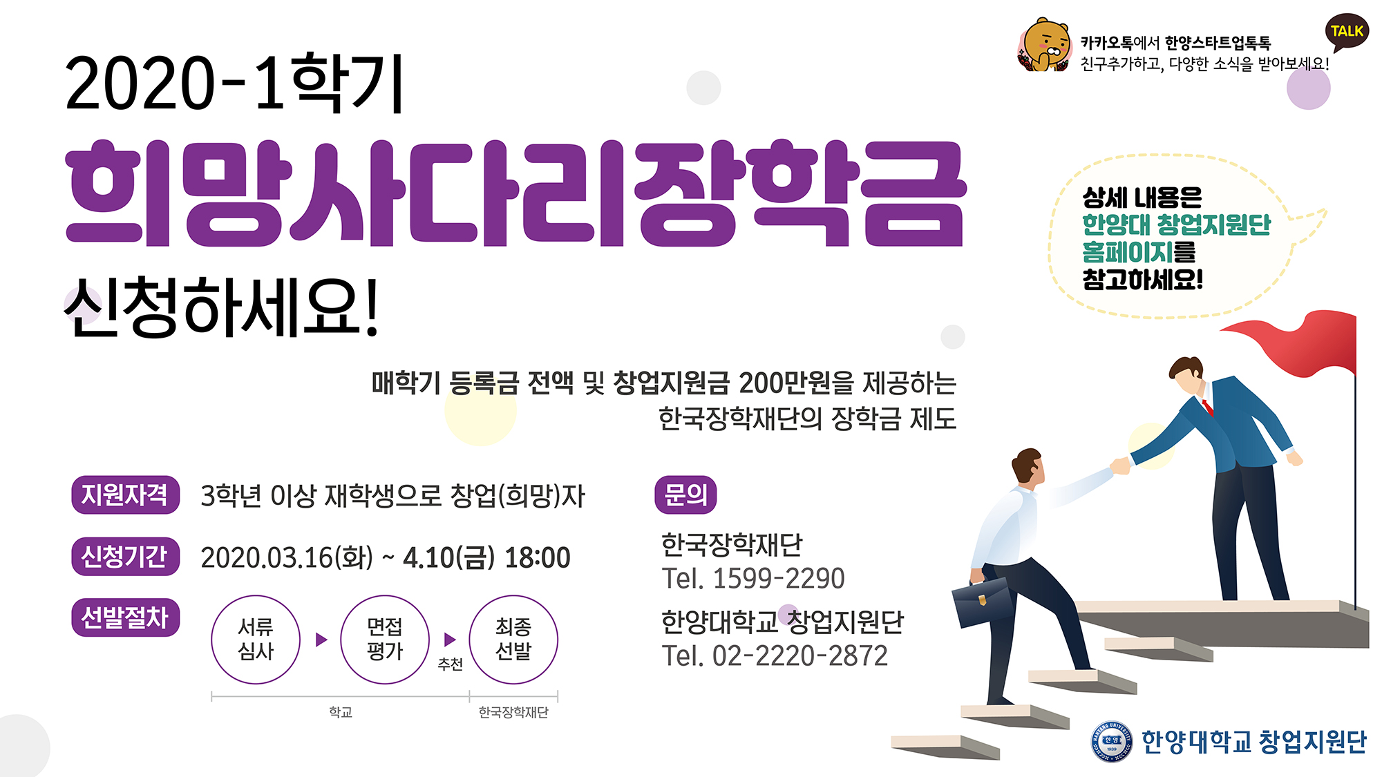 1.창업지원단에서는 한국장학재단의 2020년 1학기 희망사다리 장학금(창업지원형) 신규 장학생을 모집하고 있습니다.