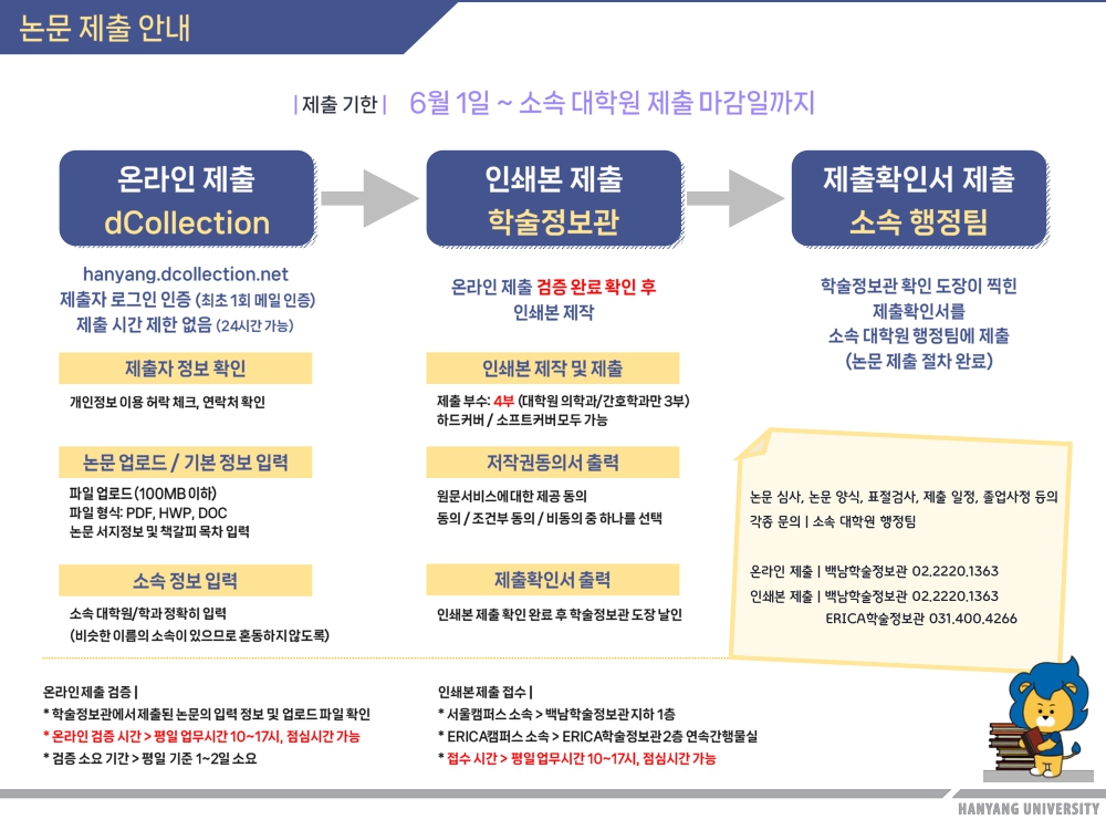 인쇄본제출 | - 백남학술정보관 지하 1층 하브루타존 - ERICA학술정보관 2층 연속간행물실 | 제출 시간: 평일 10~17시 |