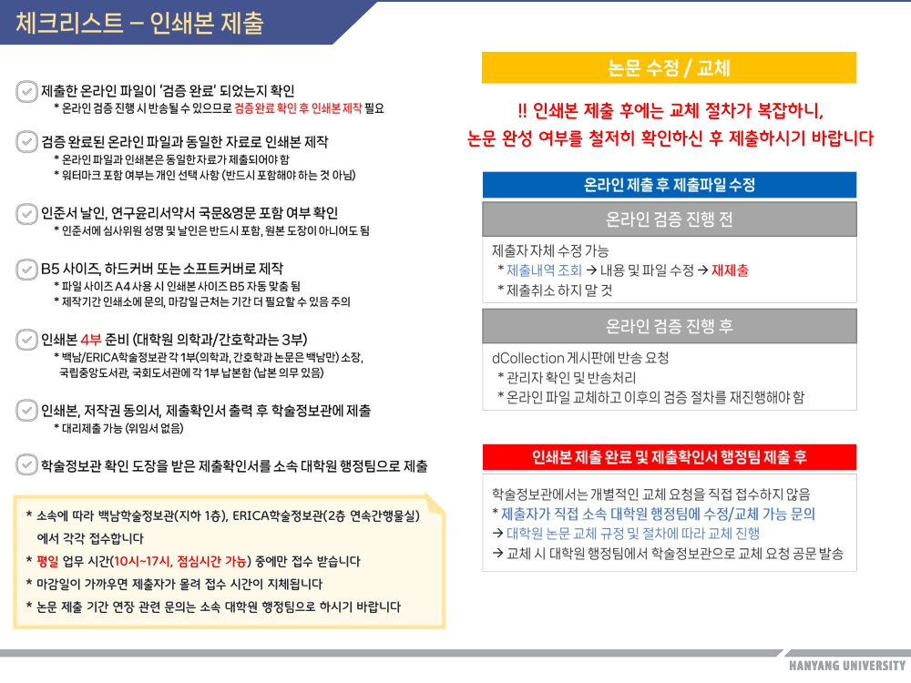 - 인쇄본 제출완료 및 제출확인서 행정팀 제출 이후의 수정/교체 대상 논문은
