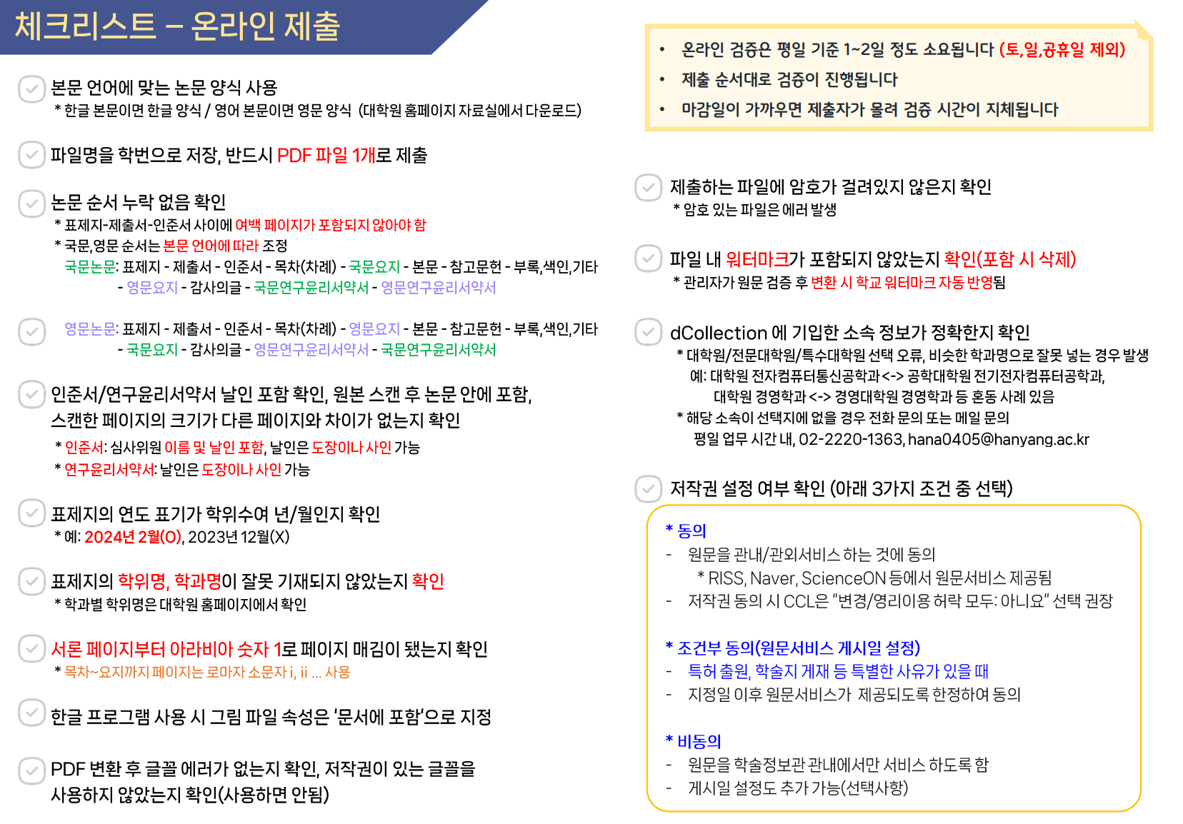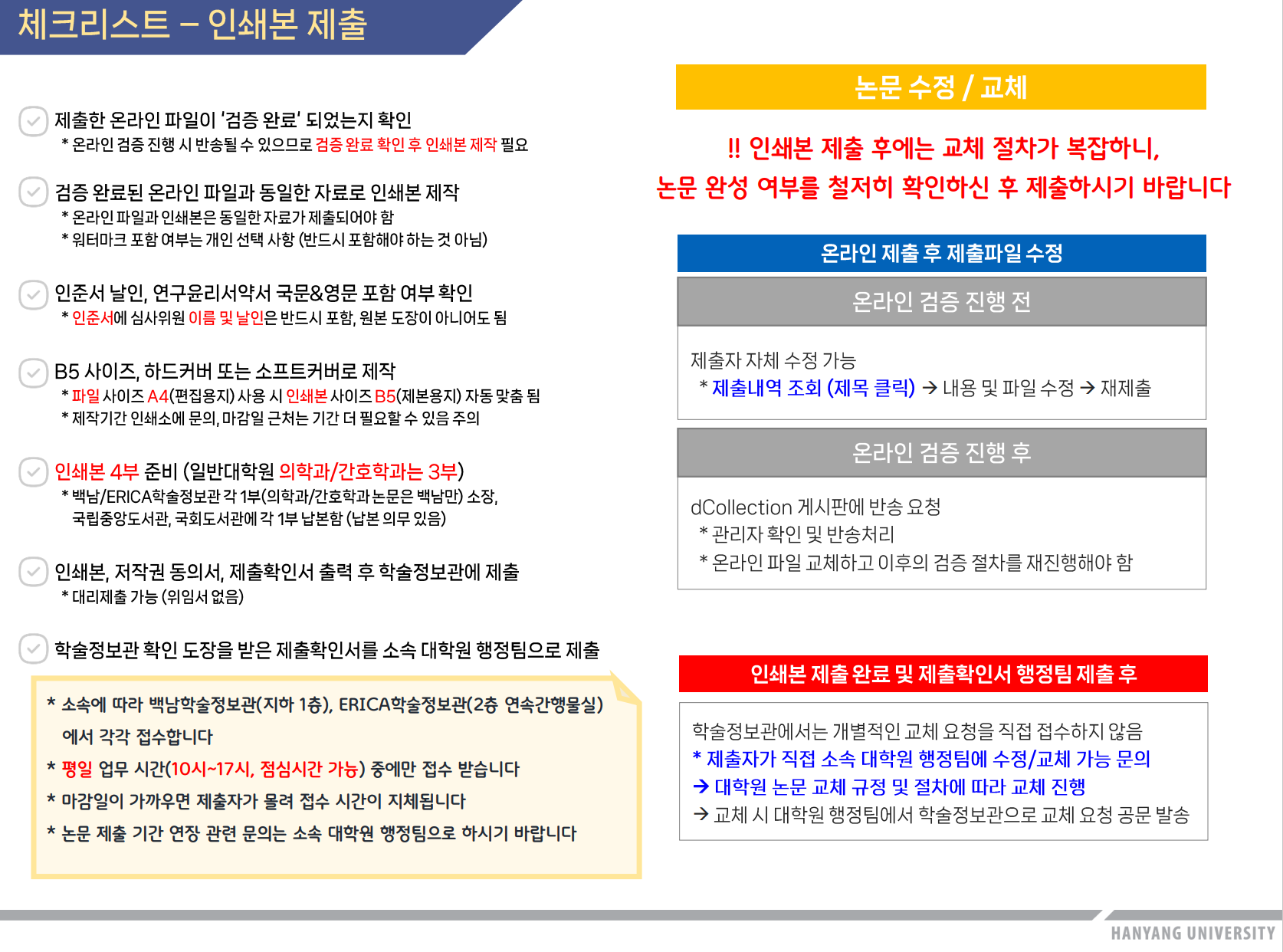 인쇄본제출 | 4부(대학원 의학과/간호학과는 3부) 제출 시간: 평일 10~17시 | - 백남학술정보관 지하 1층 하브루타존 - ERICA학술정보관 2층 연속간행물실 |