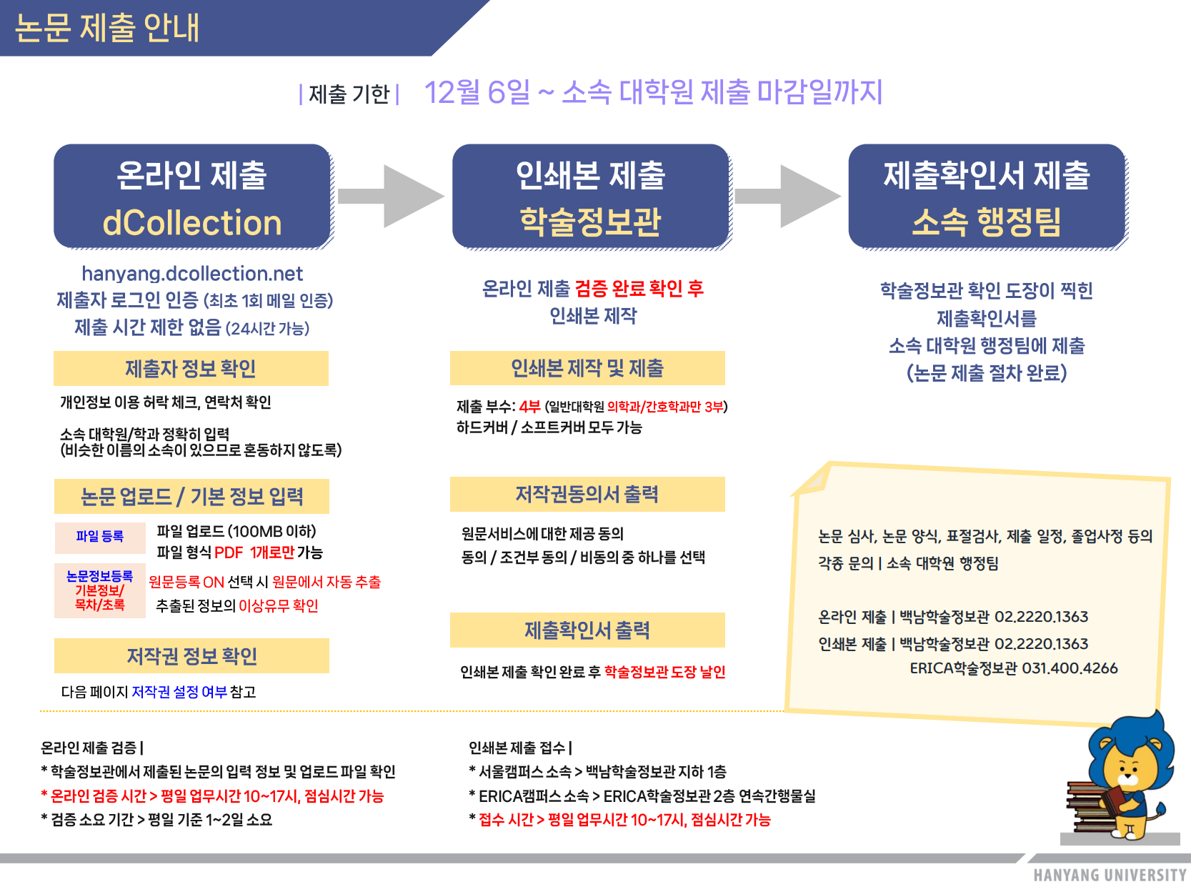 인쇄본제출 | 4부(대학원 의학과/간호학과는 3부) 제출 시간: 평일 10~17시 | - 백남학술정보관 지하 1층 하브루타존 - ERICA학술정보관 2층 연속간행물실 |