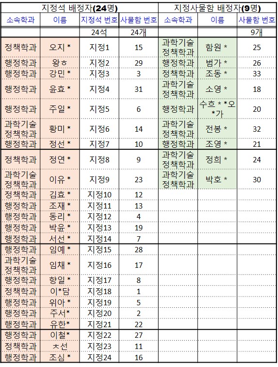 24년2학기 공용연구실 배정현황입니다. 24학년2학기 지정좌석 및 사물함 배정은, 신청자 중에서 (1) 이번 학기 논문제출 예정인 풀타임 재학생과 (2)이번 학기 논문을 제출할 예정인 연구등록생 위주로 되었습니다.