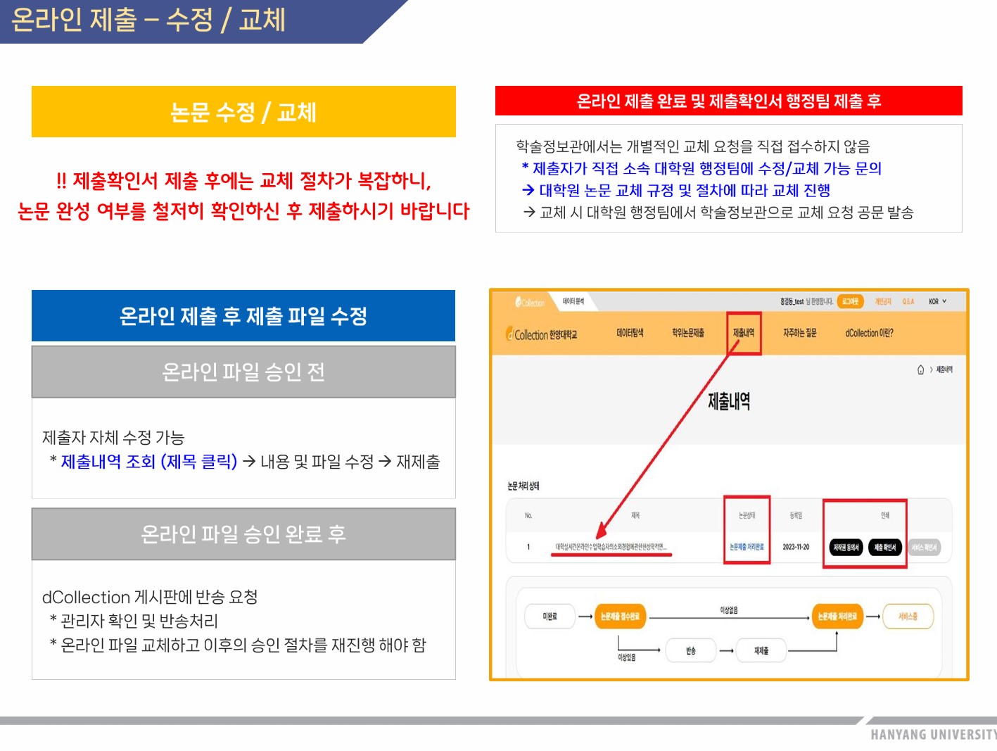 - 온라인 제출 완료 및 제출확인서 행정팀 제출 이후의 수정/교체 대상 논문은 대학원 논문 교체 규정 및 절차에 따라 진행됨. 소속 대학원 행정팀에서 확인 후 백남학술정보관으로 교체 요청 공문 발송(일반대학원은 단과대학에서 백남학술정보관으로 직접 발송)
