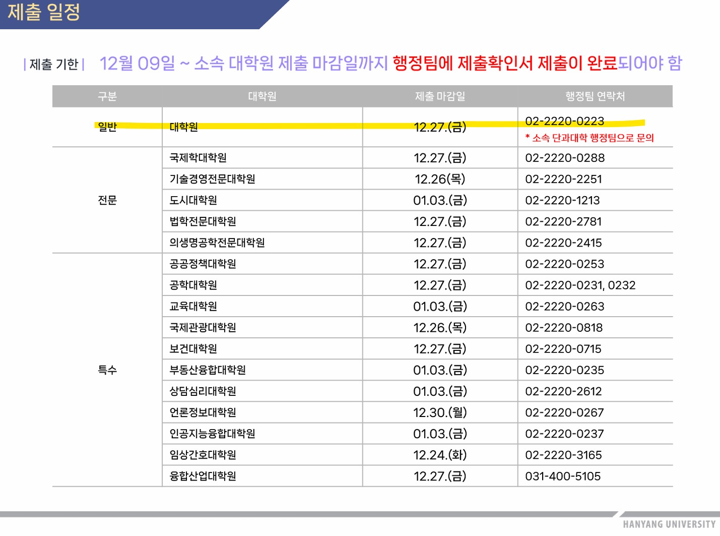 1. 제출일정: 2024.12.09.(월)부터 각 대학원 제출마감일까지(정책과학대학은 일반대학원이므로 12월27일까지 제출)