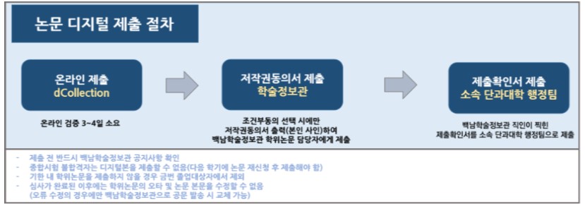 - 학위논문 ”제출확인서”을 소속 단과대학 행정팀에 제출해야만 졸업대상자에 포함되므로, 백남학술정보관에서 온라인 논문 제출후 반드시 제출확인서를 행정팀으로 12월27일까지 제출해주셔야 합니다.