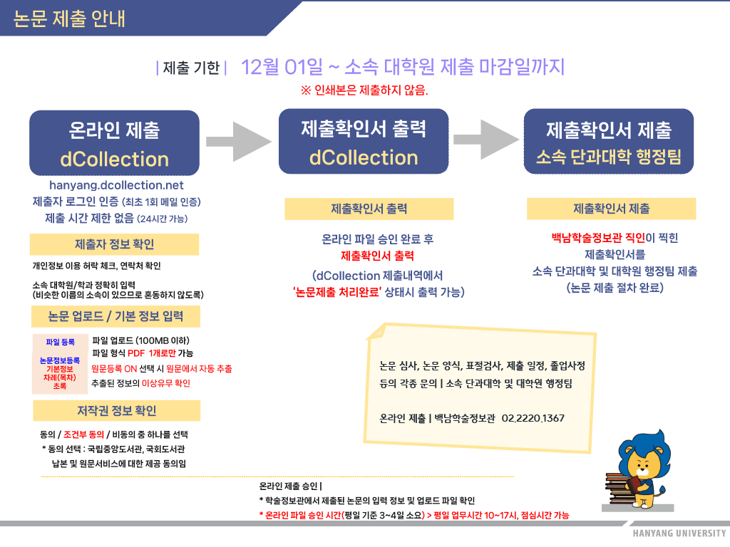 학위논문 ”제출확인서”을 소속 단과대학 행정팀에 제출해야만 졸업대상자에 포함되므로, 백남학술정보관에서 온라인 논문 제출후 반드시 제출확인서를 행정팀으로 12월23일까지 제출해주셔야 합니다.