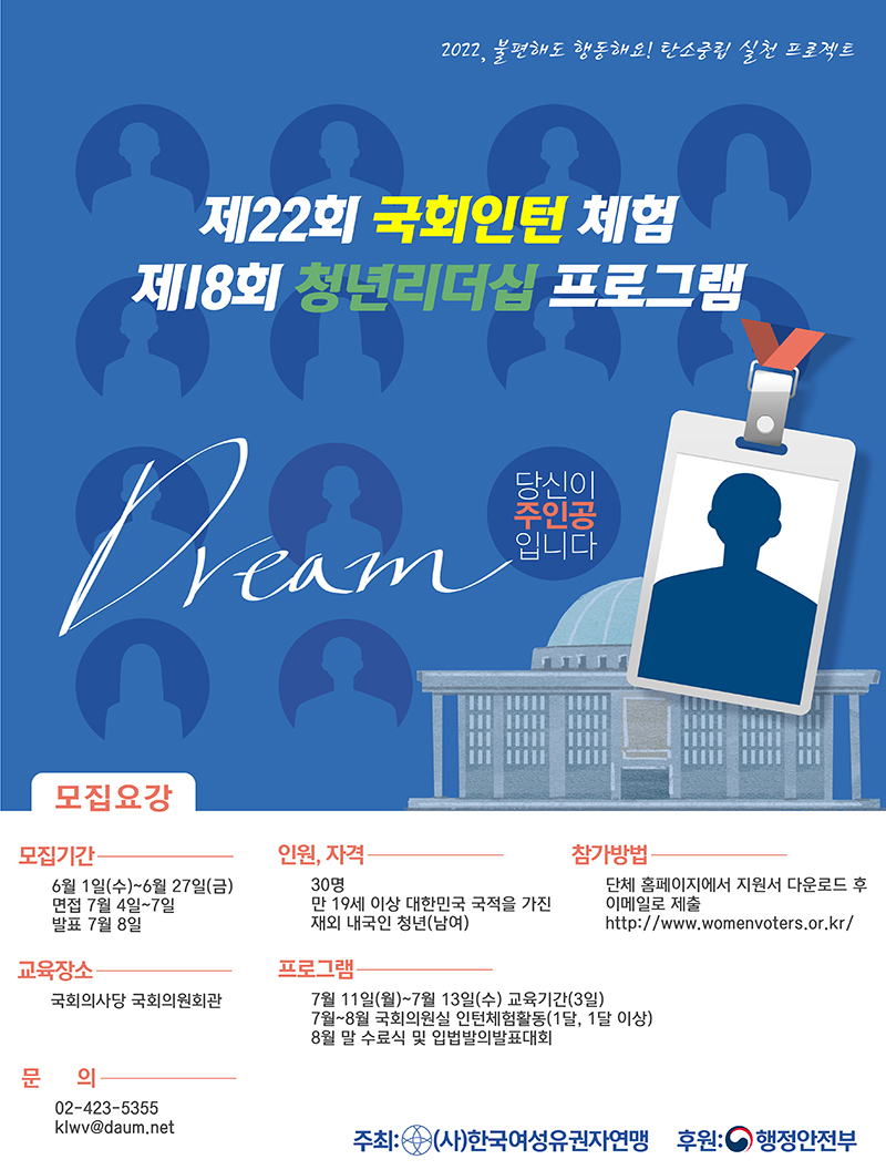 차세대 정치 리더를 키우기 위하여 ‘제22회 국회인턴ㆍ제18회 청년리더십 프로그램’을 진행합니다.