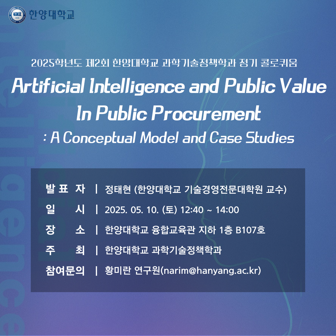 이번 2025년도 제2회 콜로퀴움 진행자는 한양대학교 과학기술경영전문대학원(MOT)의 정태현 교수님으로, "Artificial Intelligence and Public Value in Public Procurement: A Conceptual Model and Case Studies"를 주제로 진행될 예정입니다.