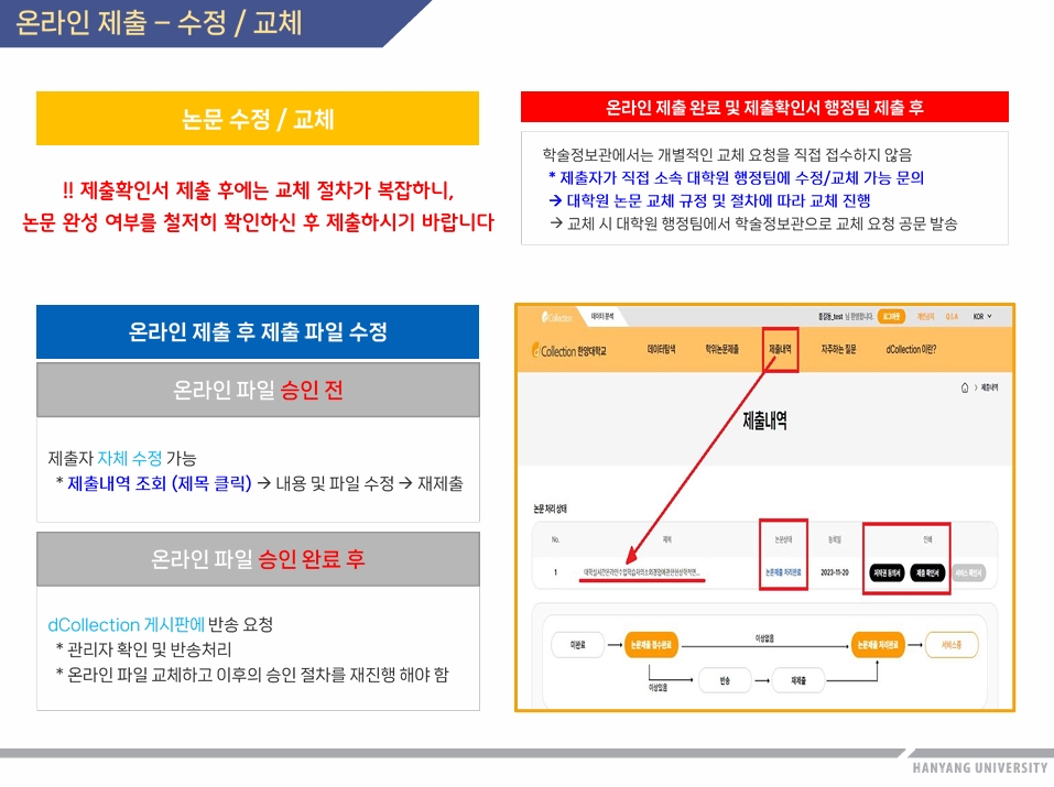 - 온라인 제출 완료 및 제출확인서 행정팀 제출 이후의 수정/교체 대상 논문은 대학원 논문 교체 규정 및 절차에 따라 진행됨. 소속 대학원 행정팀에서 확인 후 백남학술정보관으로 교체 요청 공문 발송(일반대학원은 단과대학에서 백남학술정보관으로 직접 발송)