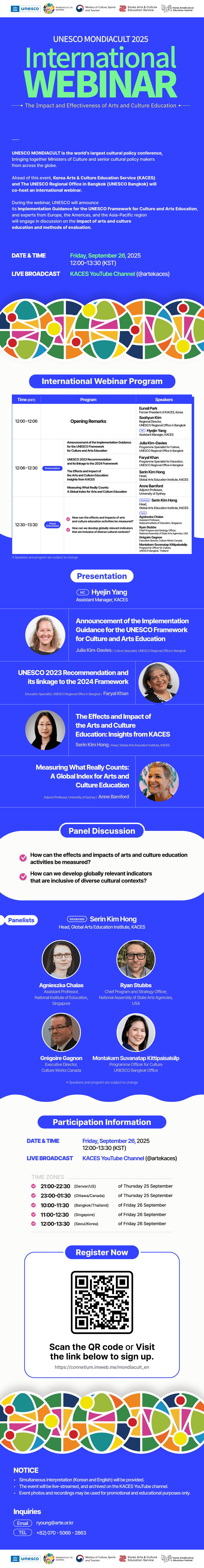 1. 한국문화예술교육진흥원은 유네스코 방콕 사무소와 함께 2025 유네스코 몬디아컬트 문화정책 회의의 사전 컨퍼런스로 <국제 웨비나>를 개최합니다. 본 온라인 행사에서는 유네스코 문화예술교육 프레임워크 이행 지침을 안내하고 문화예술교육의 효과와 영향력을 논의하는 자리입니다.