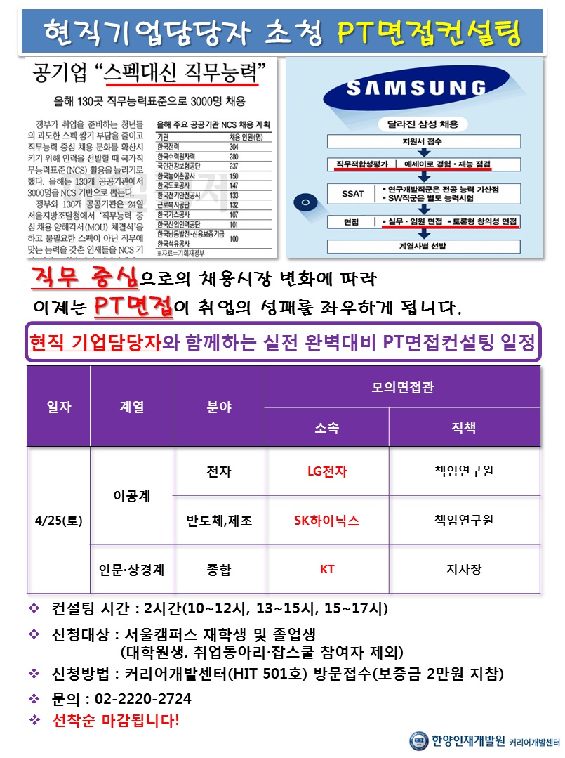 커리어개발센터에서는 2015년 상반기 공채를 대비하여 현직자 초청 모의 PT면접 프로그램을 기획하였습니다. 비좁고 힘든 취업(채용)에서 취업 필수역량인 면접역량을 기르도록 다음과 같이 휴일에 모의면접 프로그램을 진행하오니, 많은 학생들이 참석하여 기회를 갖도록 적극 홍보하여 주시기 바랍니다.