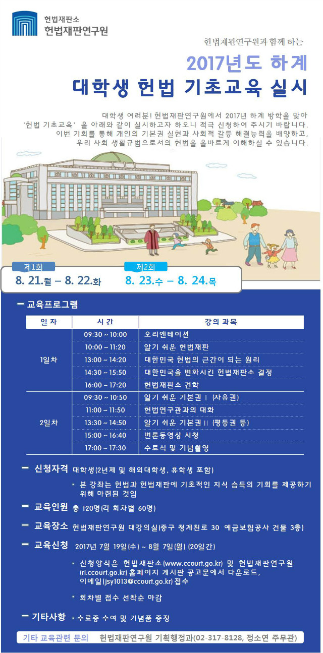 헌법재판연구원에서는 2017년 하계 방학을 맞아 대학생 헌법 기초교육을 실시할 예정입니다.